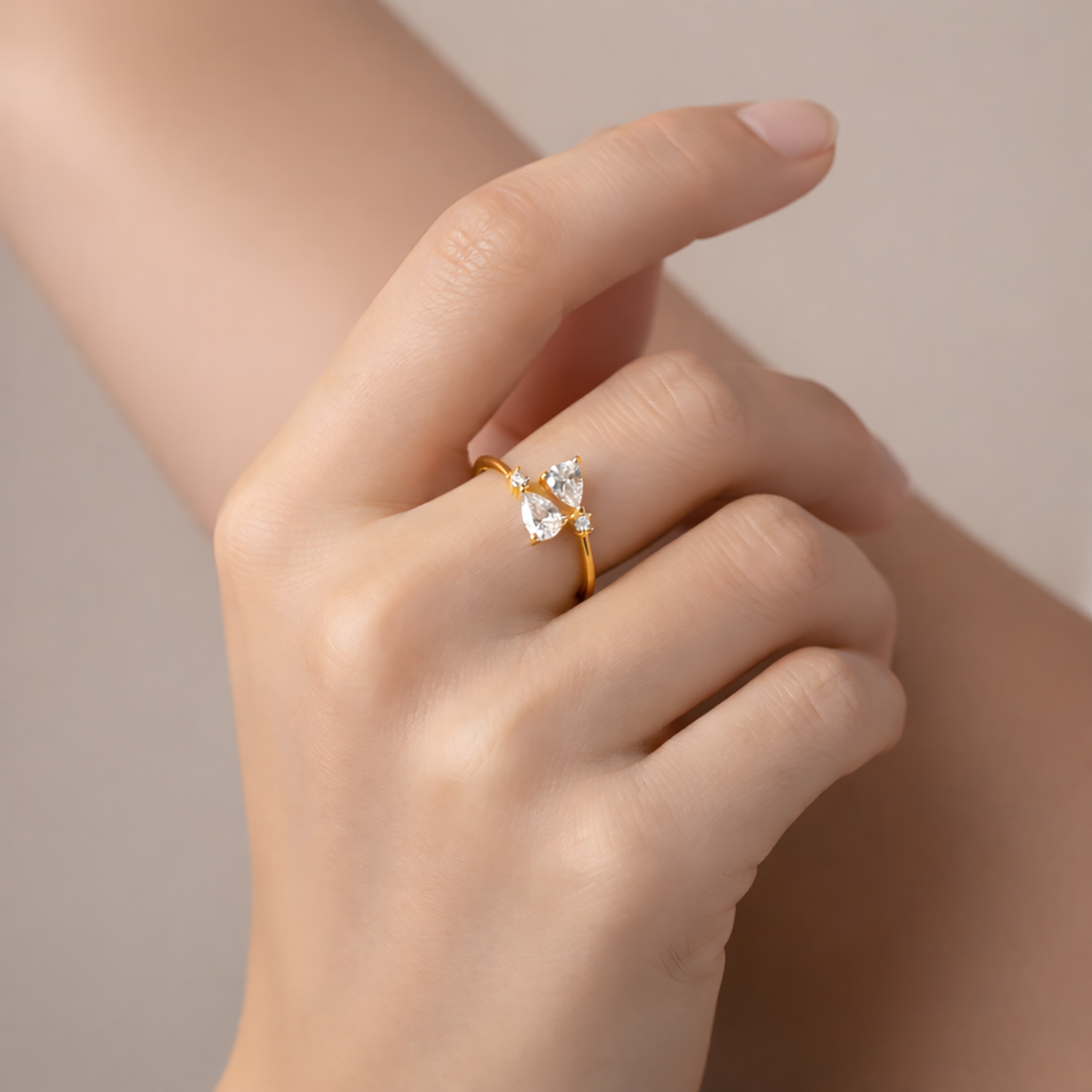 Zarif detayların ışıltıyla buluştuğu bu özel tasarım yüzük, iki damla kesim taş detayıyla romantik ve modern bir stil sunar.