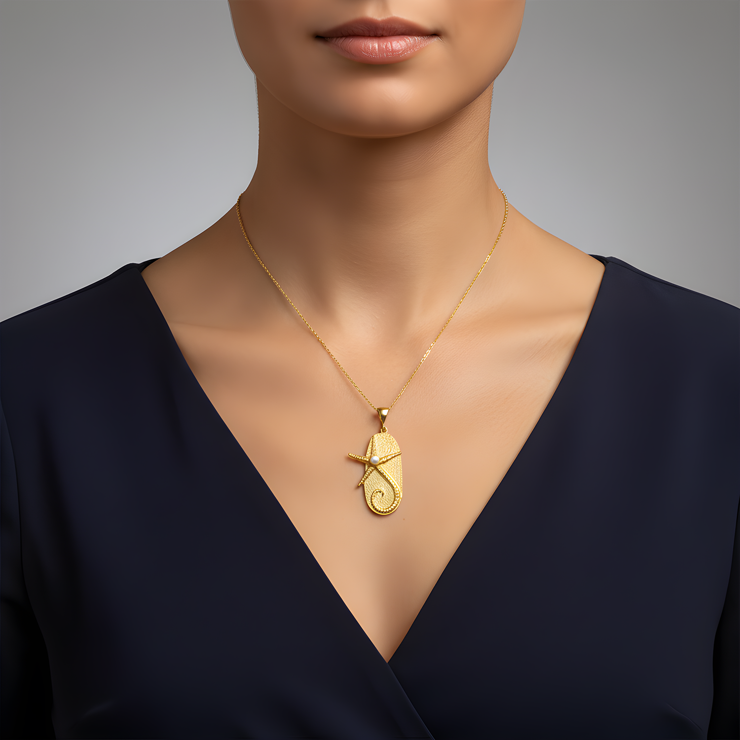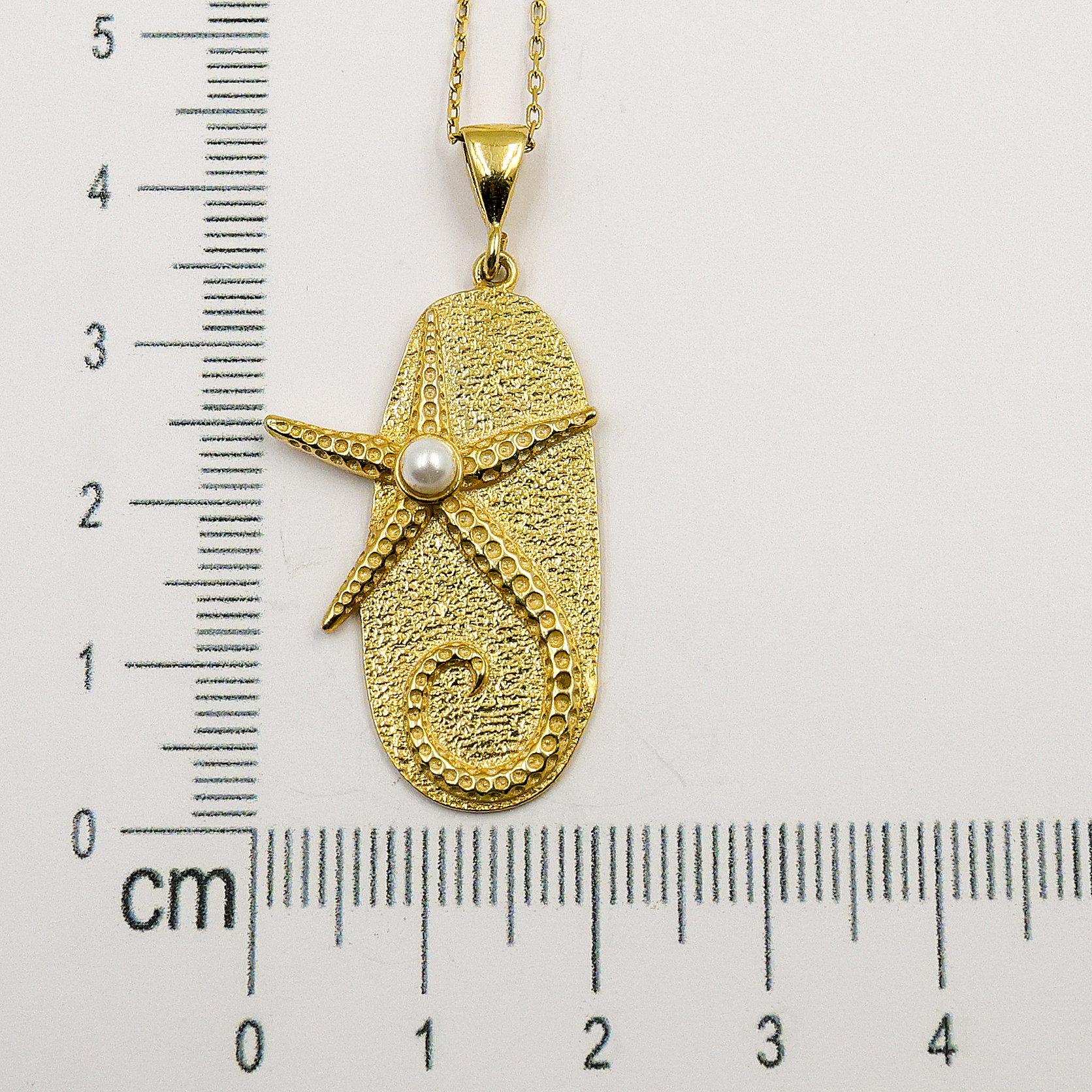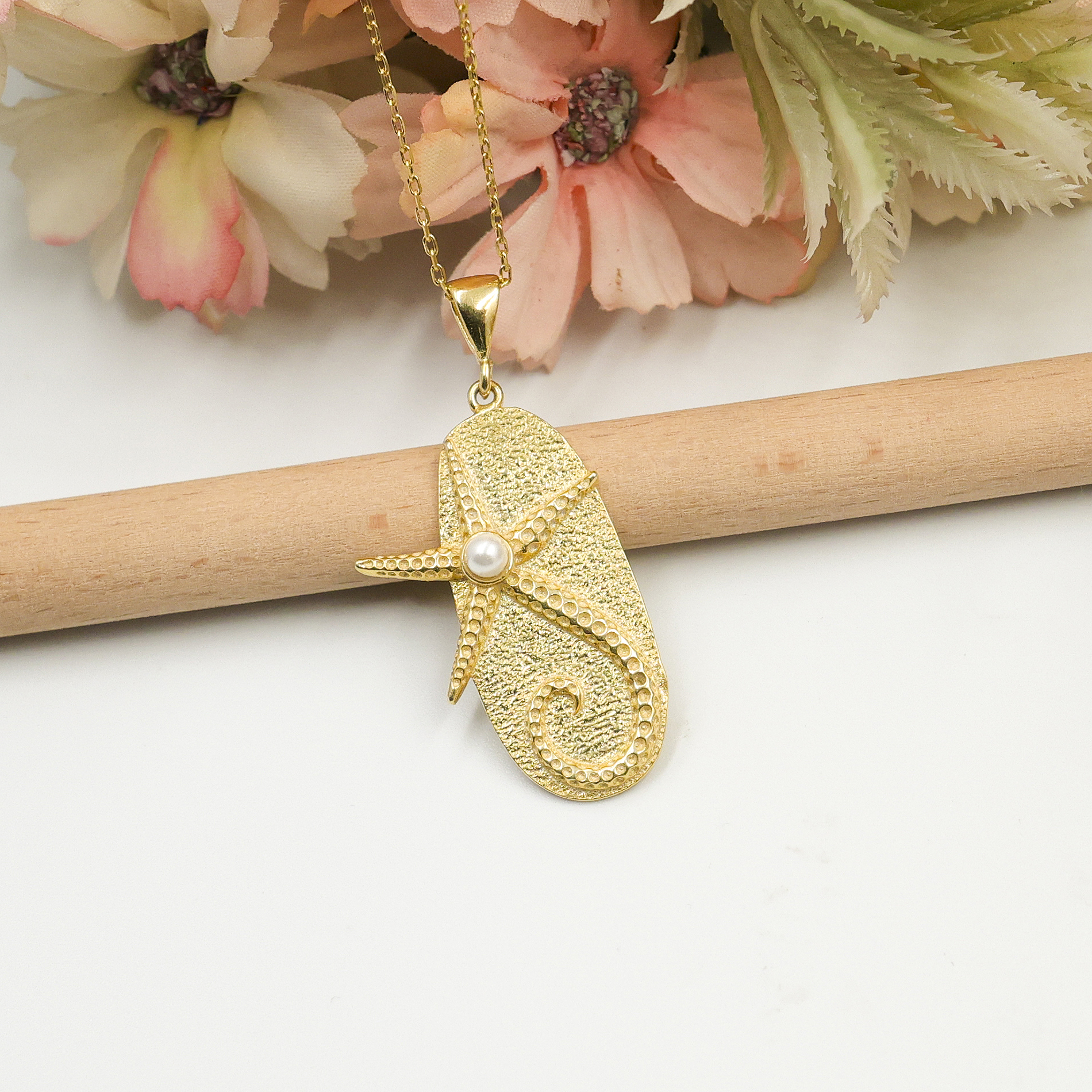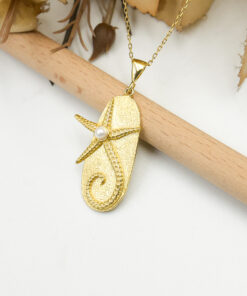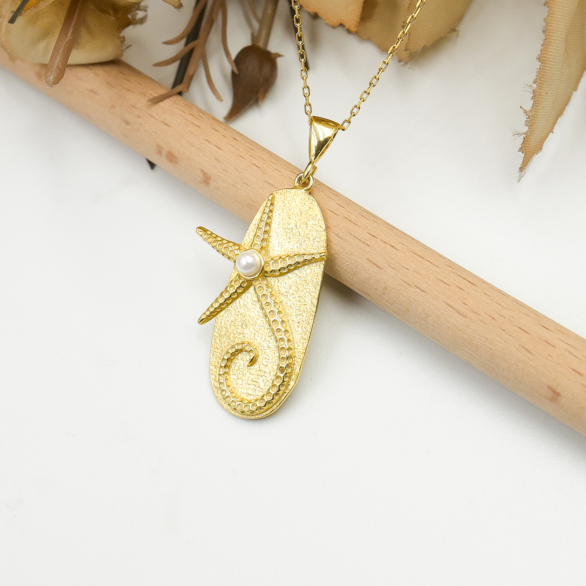 Deniz Yıldızı İnci Detaylı Gümüş Kolye – Sarı Altın Kaplama Deniz Temalı Tasarım Kolye