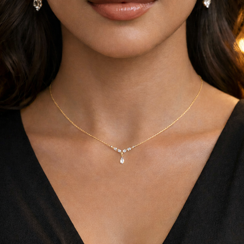 Işıltının en zarif halini yansıtan bu özel tasarım kolye, pırlanta kalitesinde zirkon taşları ve estetik V form dizilimi ile boyun hattını zarif şekilde vurgular.