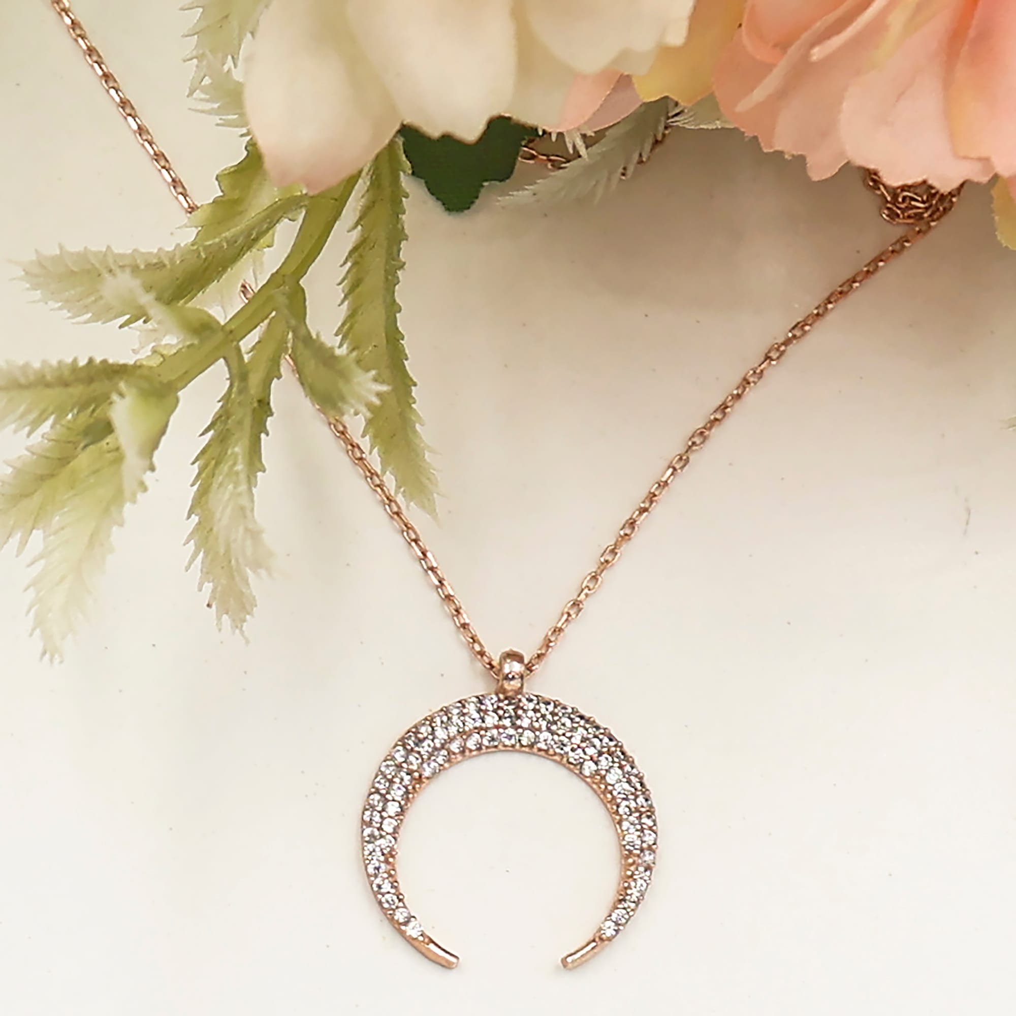 Rose Zirkon Taşlı Büyük Hilal Kolye