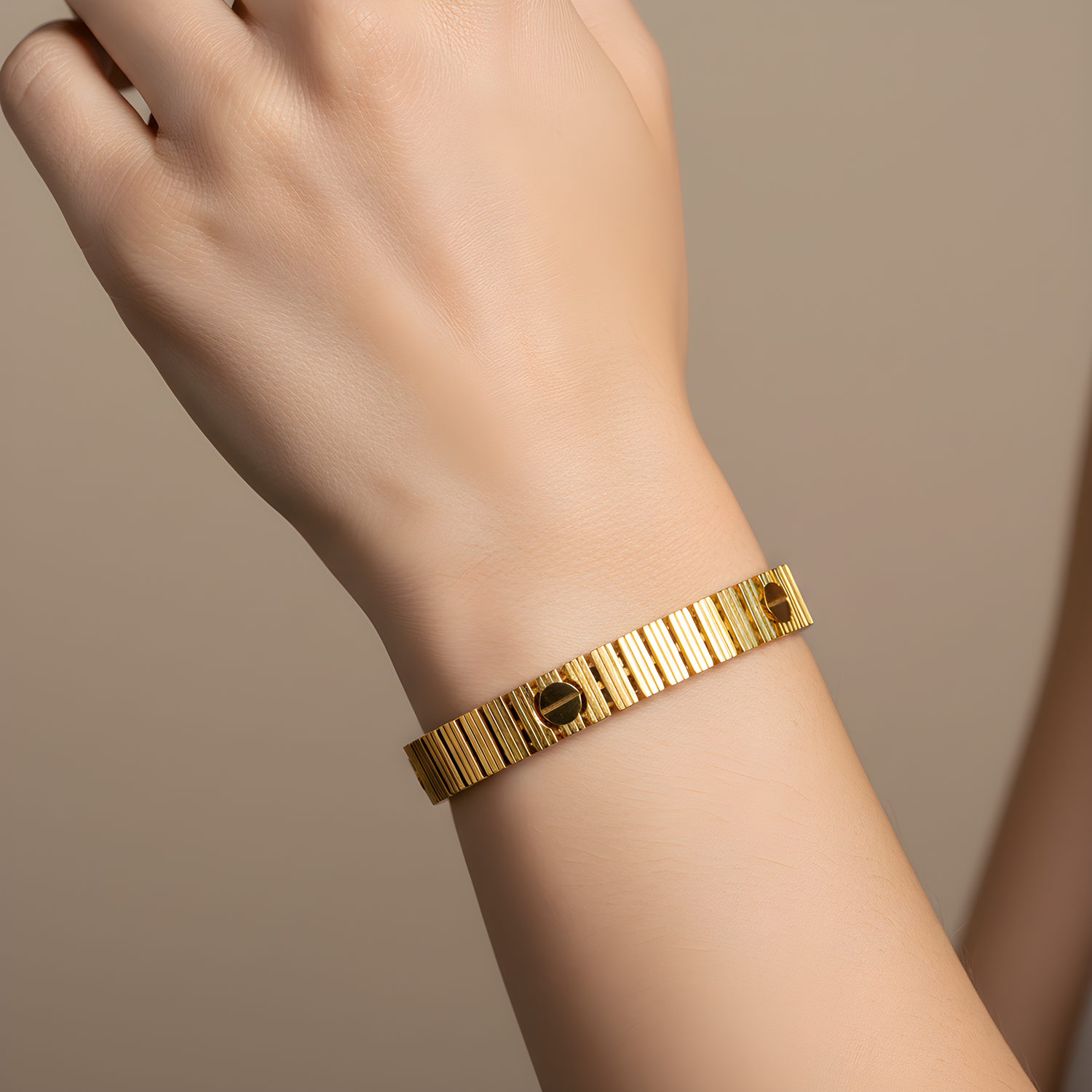 Modern lüks stilin en ikonik detaylarından biri olan vida formu, bu özel tasarım bileklikte güçlü ve zamansız bir duruşla hayat bulur.