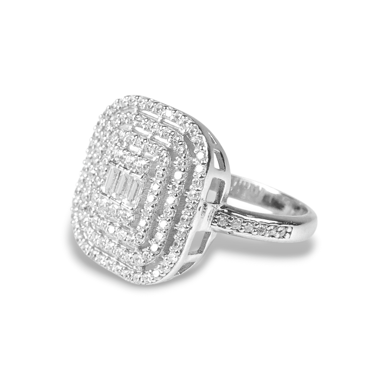 Işıltının en güçlü hali… Baget kesim zirkon taşların modern formu ve çevresini saran parlak taş detaylarıyla tasarlanan bu yüzük, dikkat çekici bir şıklık sunar.