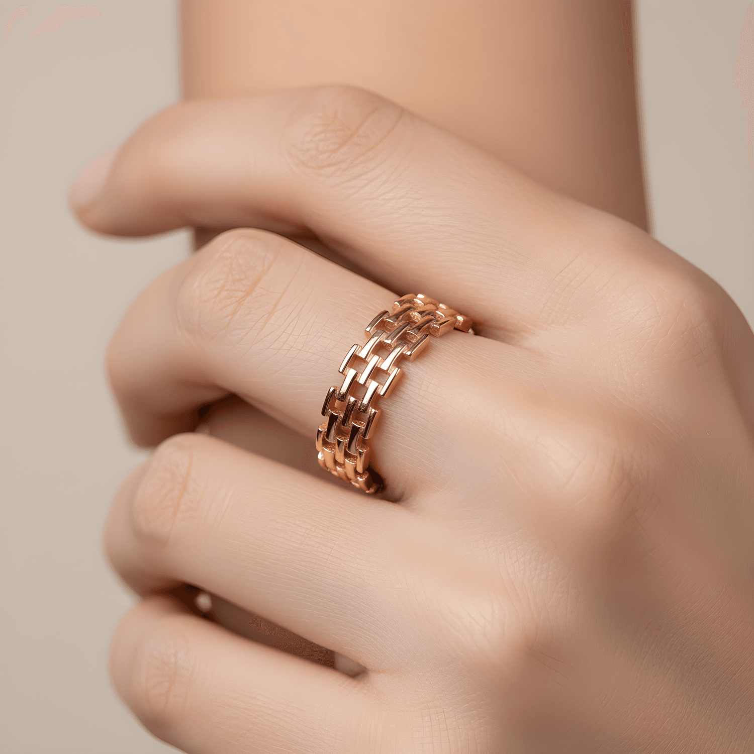 Rose gold kaplama yüzeye sıcak ve feminen bir ışıltı katarken, örgü detayları yüzüğe hacimli fakat zarif bir görünüm kazandırır.
