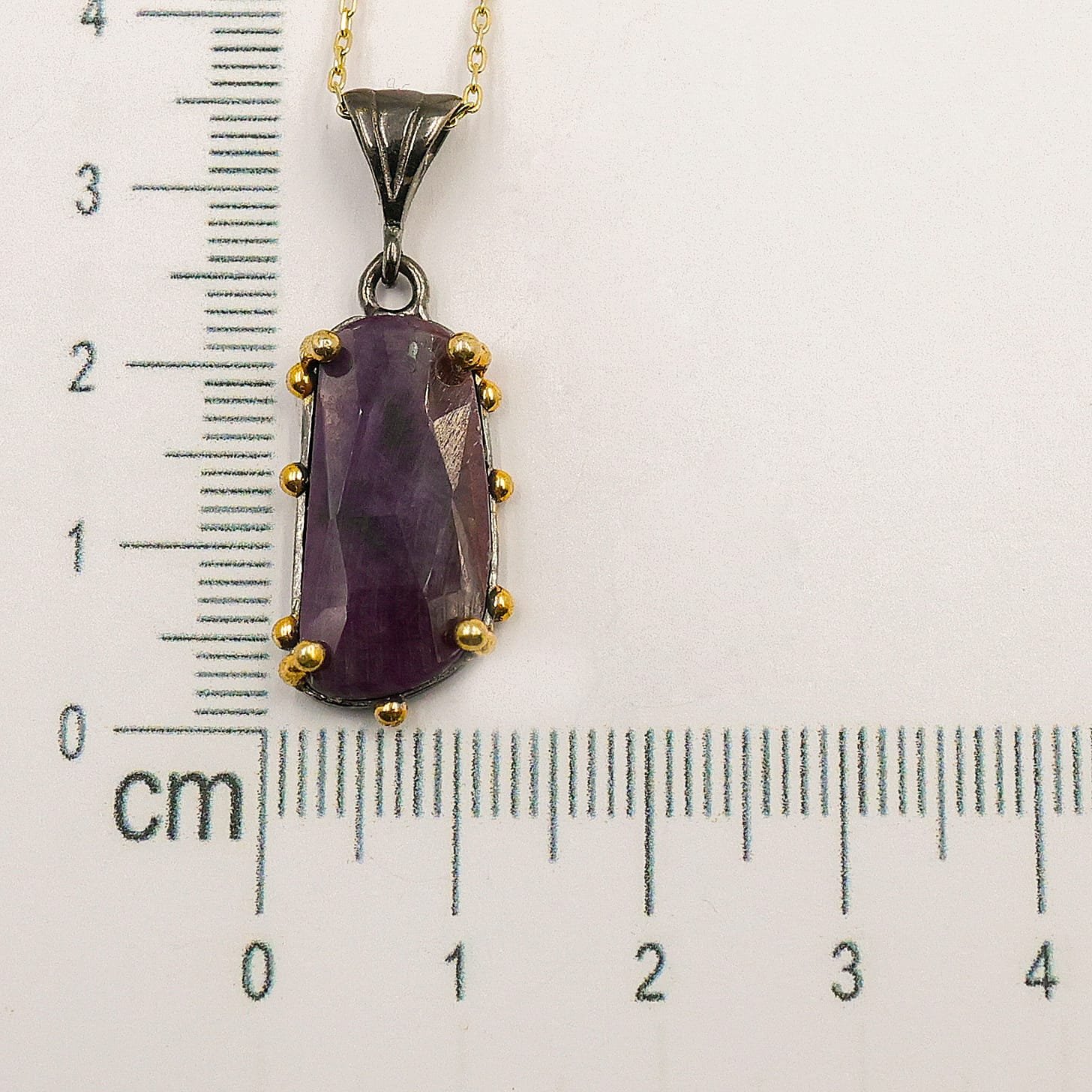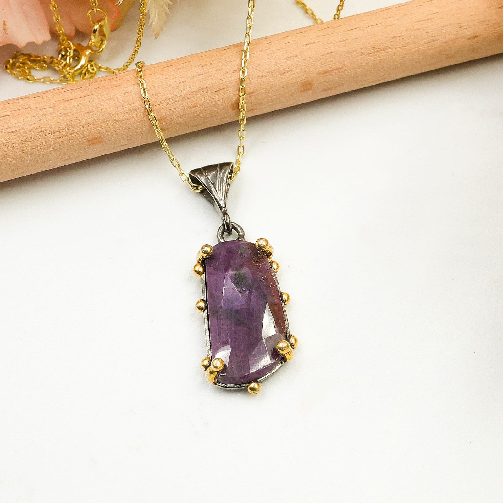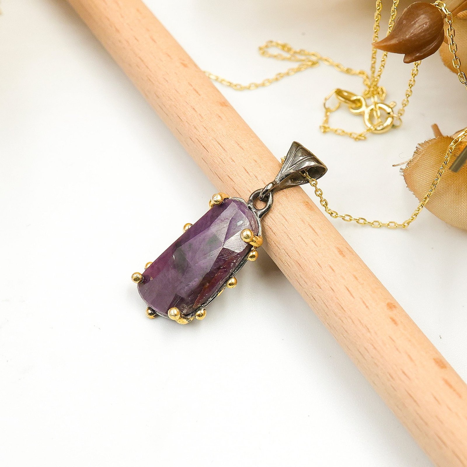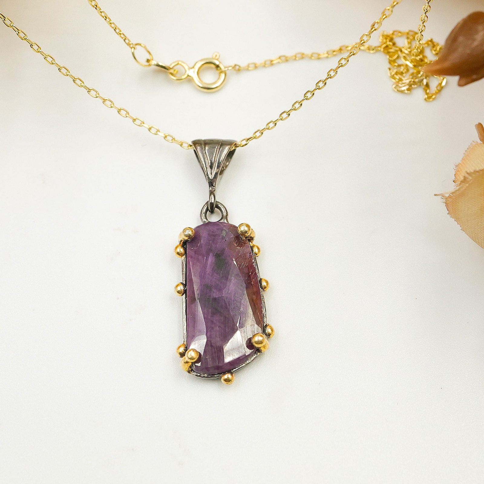 Doğal Kırmızı Safir Taşlı Gümüş Kolye – Siyah Rodaj ve Altın Kaplama Tasarım Kolye