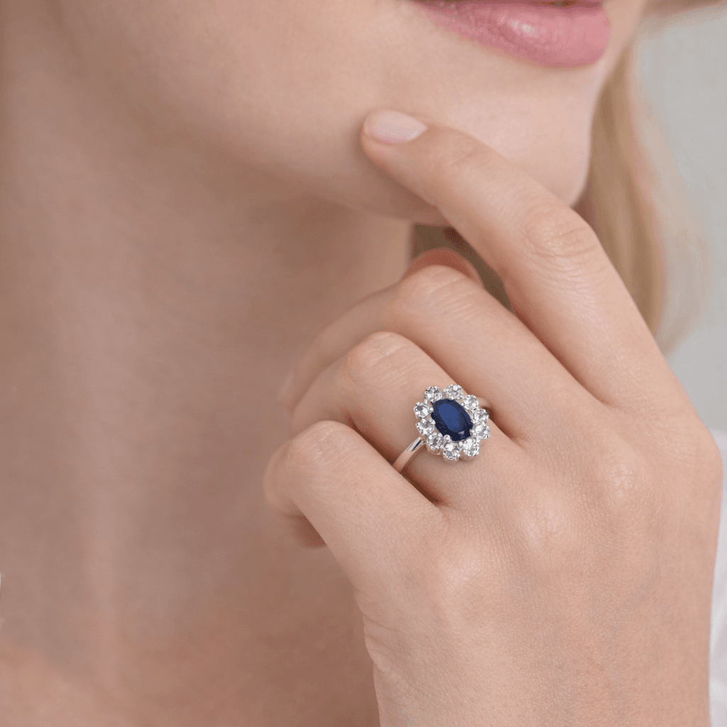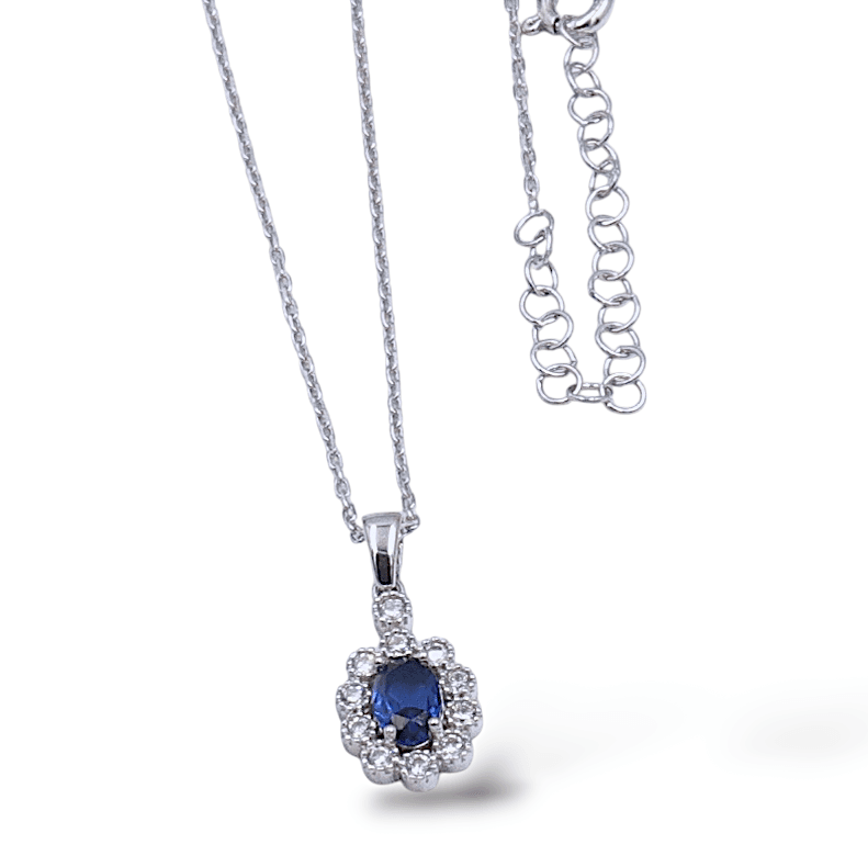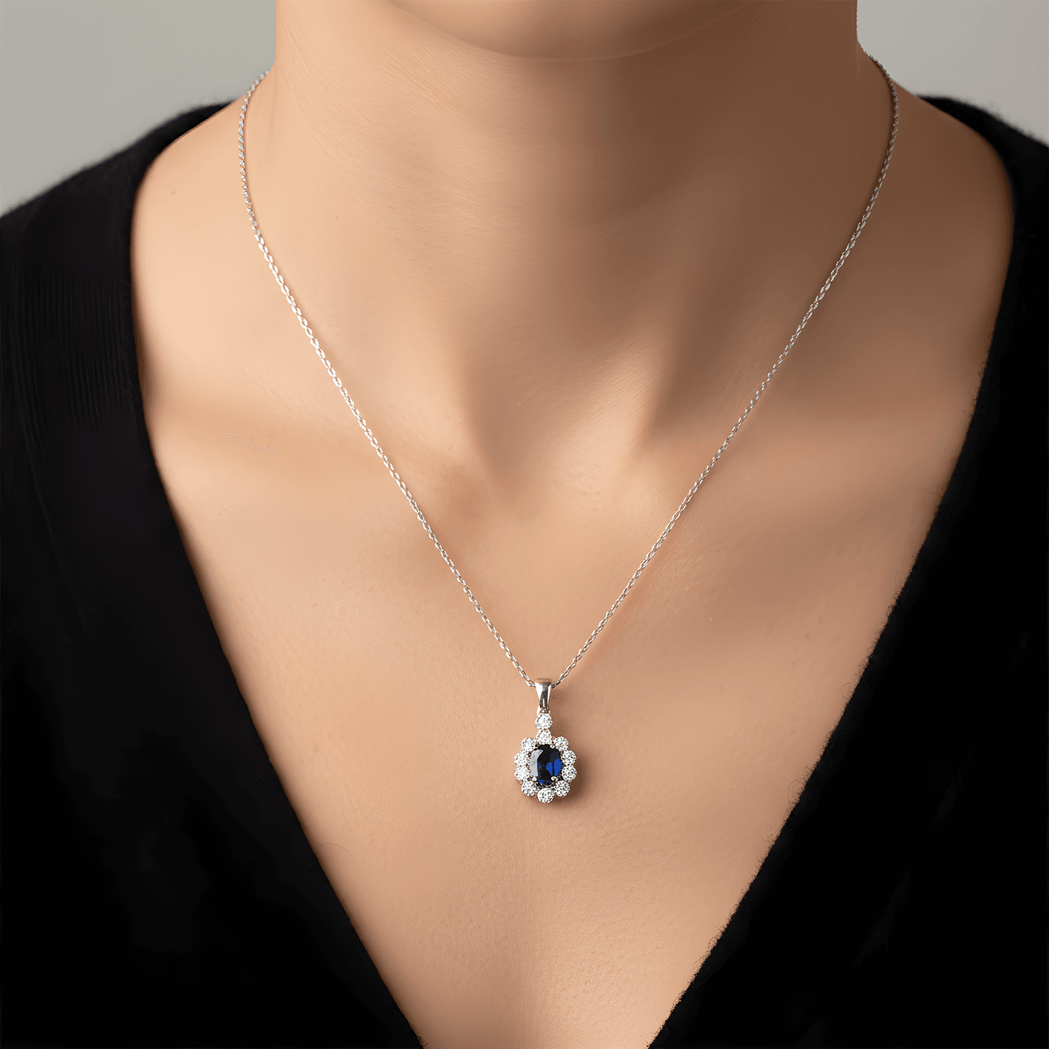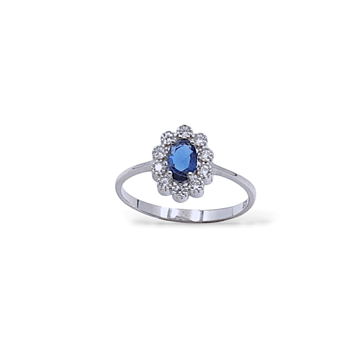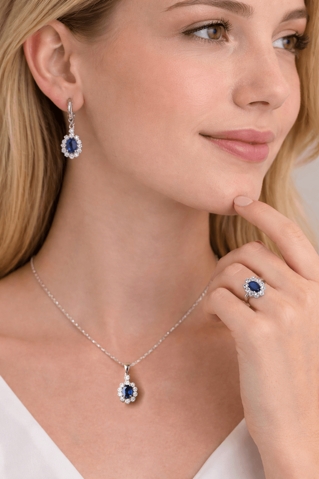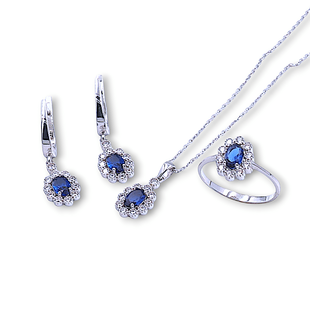 Safir görünümlü mavi taş ve zirkon detaylarla tasarlanan 925 ayar gümüş takı seti; yüzük, kolye ve küpeden oluşan zarif ve ışıltılı bir kombin sunar.